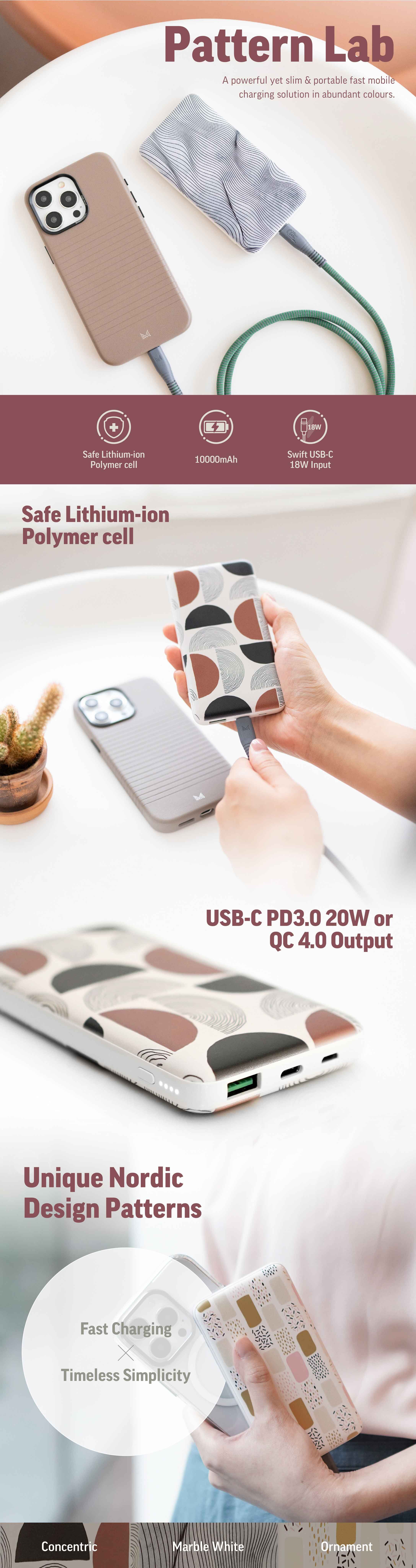 There has been a huge advancement in the powerbank technology again and again over the past years. PD3.0 connection has shortened charging and recharging speed by times and the newly improved lithium polymer technology has also made the size of the battery much smaller. MONOCOZZI's PATTERN LAB10000