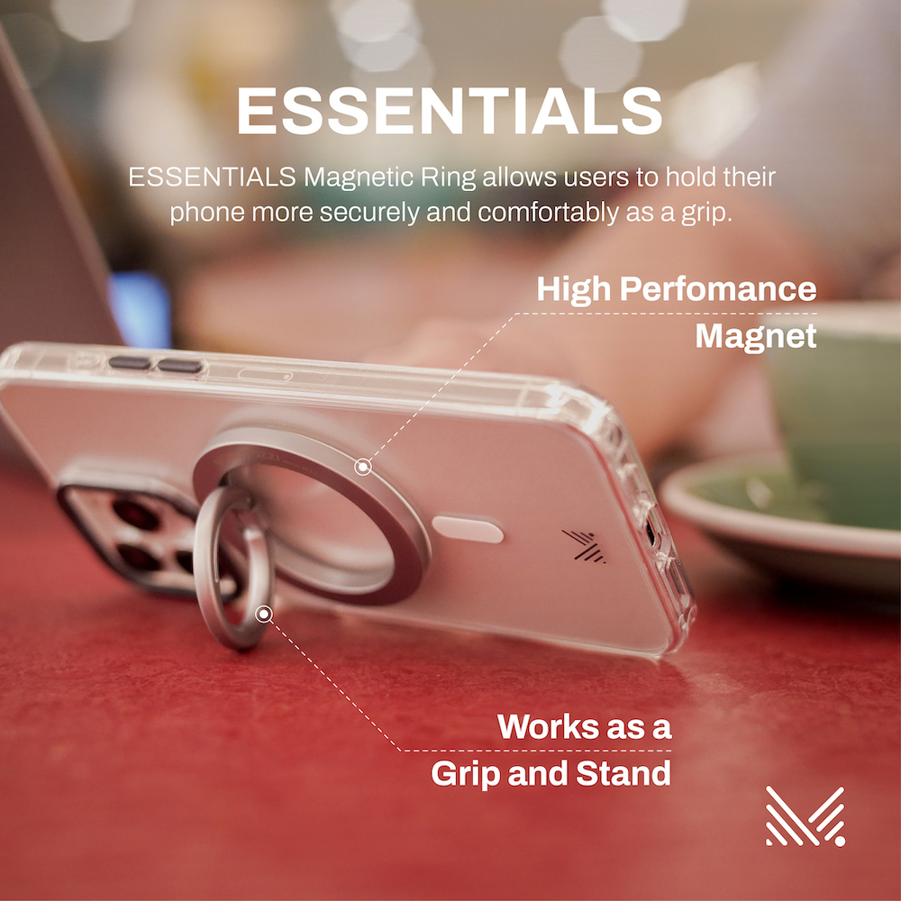ESSENTIALS Magnetic Ring acts as a small circular accessory attaches to the back of an iPhone using a very strong magnet. It allows users to hold their phone more securely and comfortably as a grip. The ring can also be used as a stand by flipping it our and propping the phone up. The magnet ring can rotate 360º for optimal viewing.