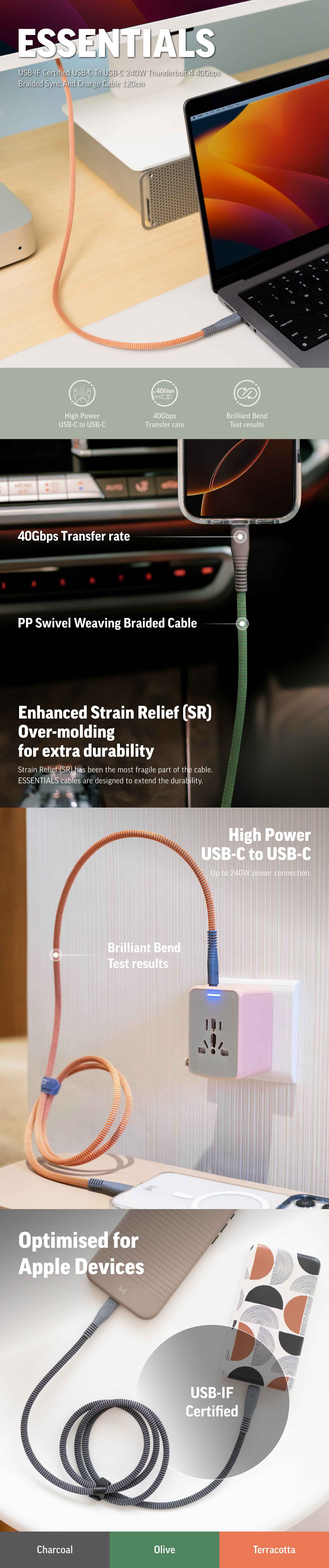 ESSENTIALS | USB-IF Certified USB-C To USB-C 240W 40Gbps Braided Sync And Charge Cable 120cm - Olive