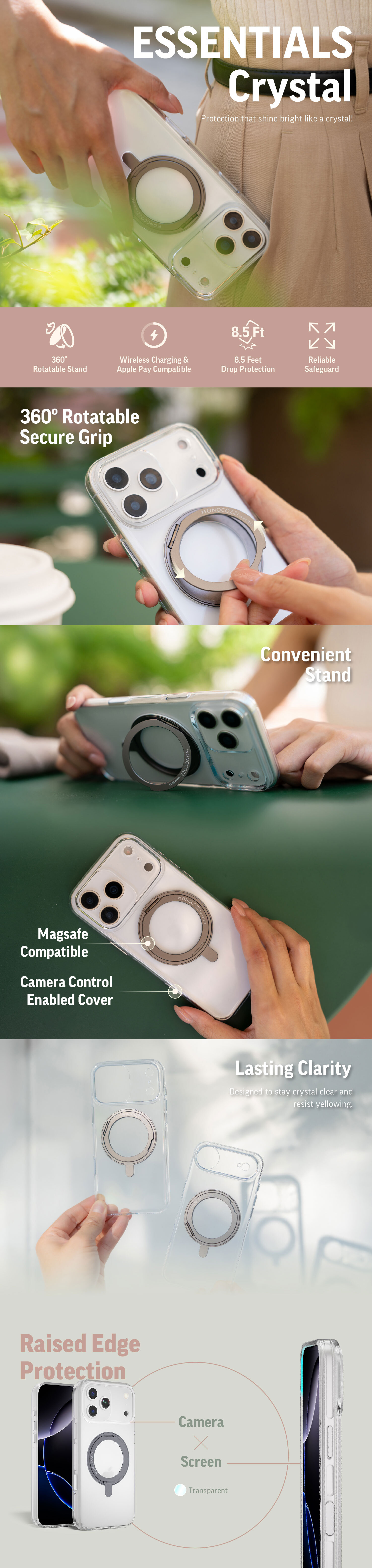 for iPhone 17 | ESSENTIALS Crystal| Magnetic Charging Compatible Shockproof Crystal Clear Case w/ rotatable ring - Transparent