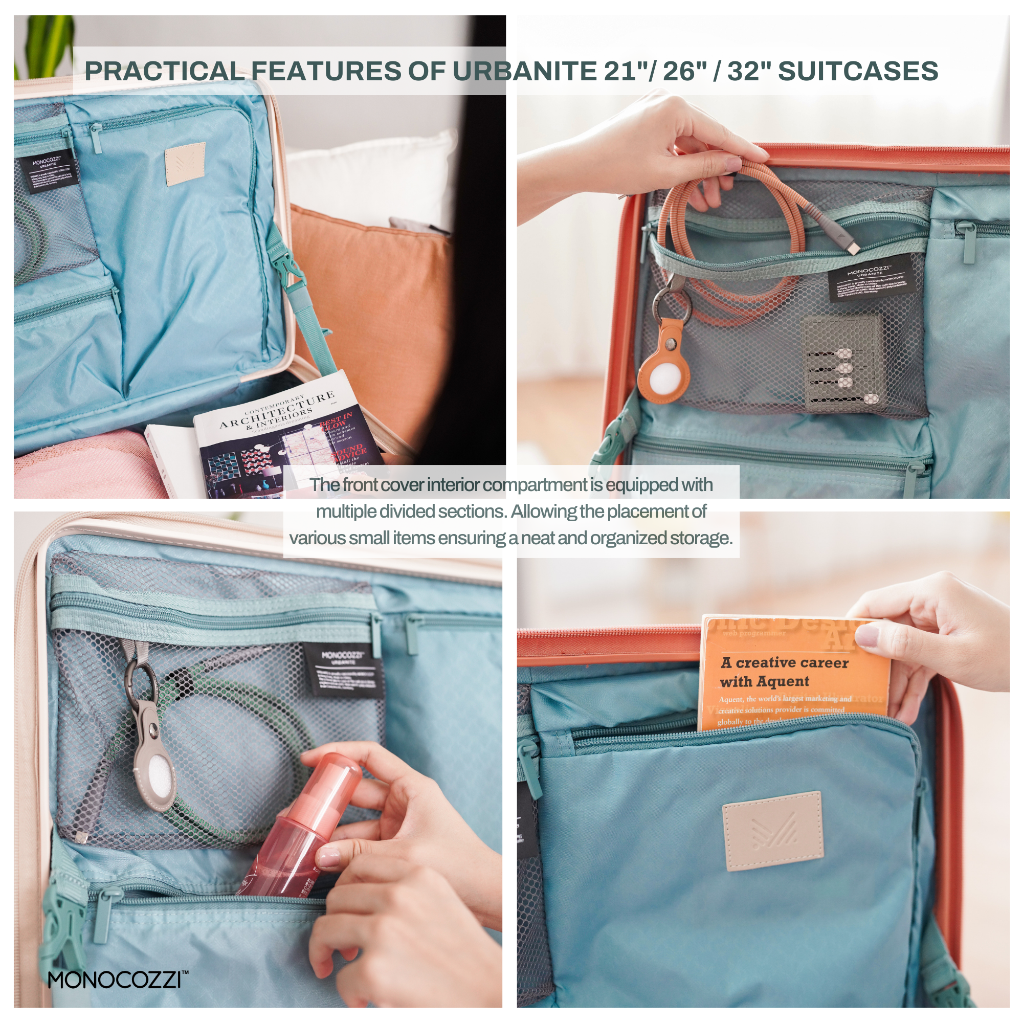 Inside the front lid of the URBANITE suitcases, discover a multitude of compartments meticulously designed to cater to your storage needs. No longer shall you grapple with the challenge of arranging small items haphazardly. With the URBANITE's thoughtfully crafted compartments and pockets, you'll effortlessly organize your essentials, optimizing space within the suitcase and allowing you to indulge in delightful shopping experiences during your journey.