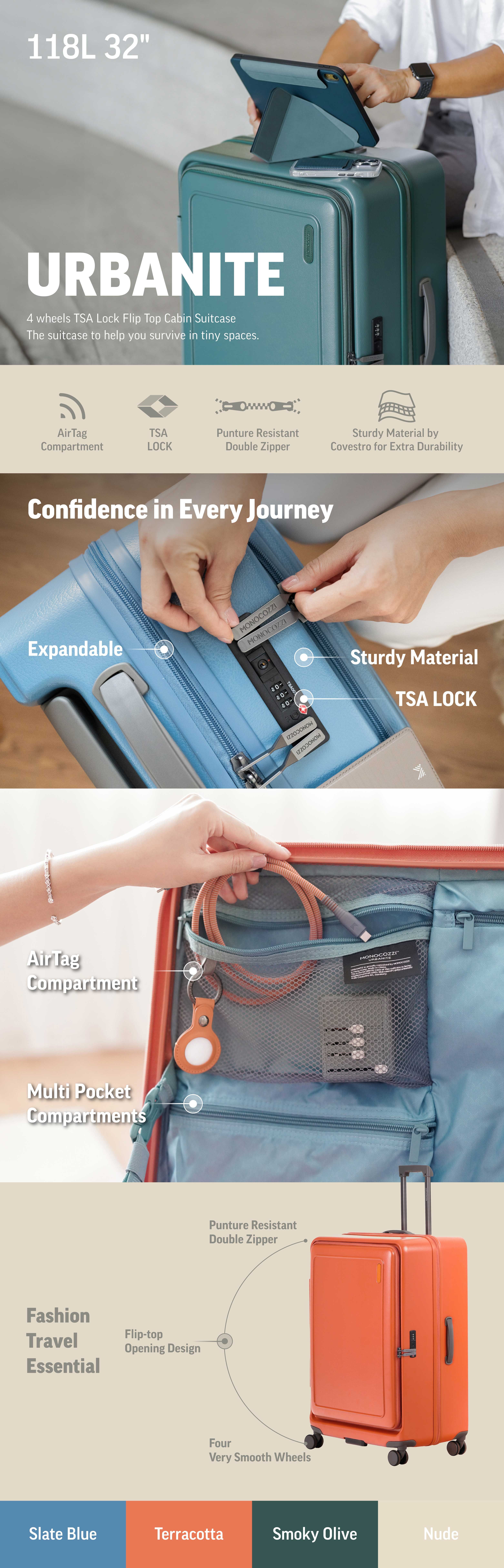The MONOCOZZI Urbanite Suitcase is a reformed design for maximising the volume and versatility. The new design flat-top opening gives you full access of the suitcase even in a tiny space!