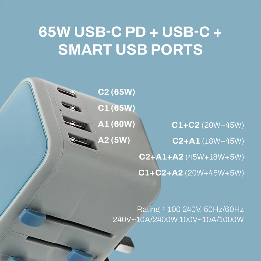 65W 的 USB-C PD(功率傳輸)端口可以快速充電高功率設備,例如筆記型電腦、平板電腦和智慧型手機等,而兩個 USB-C 端口則為其他設備提供額外的充電選擇。