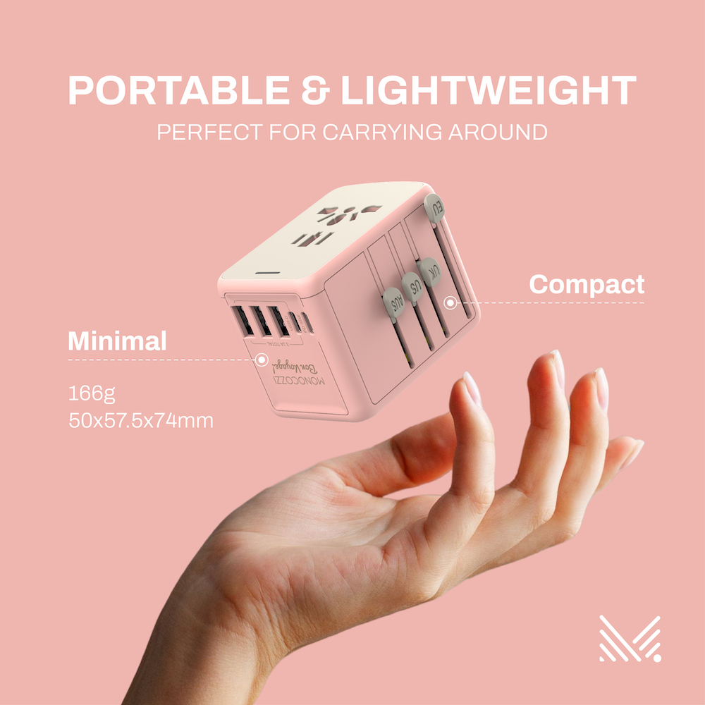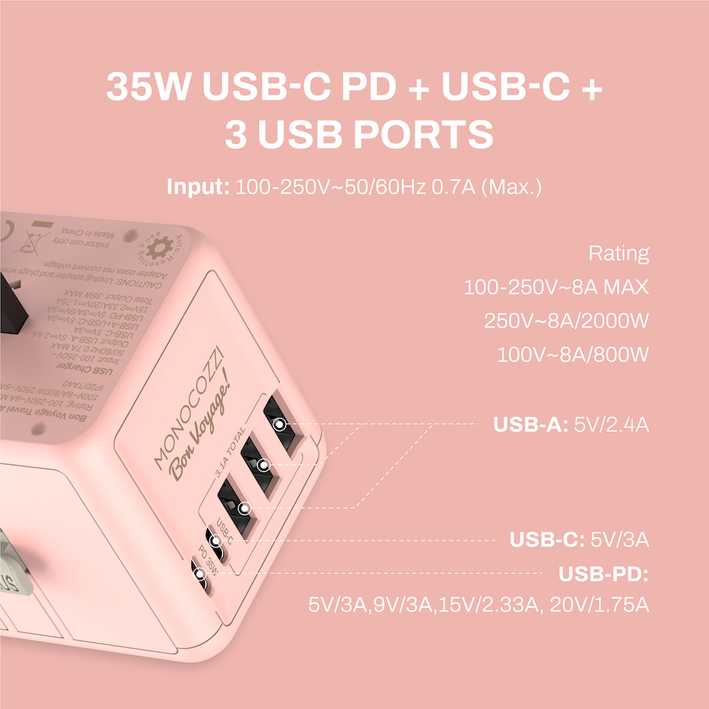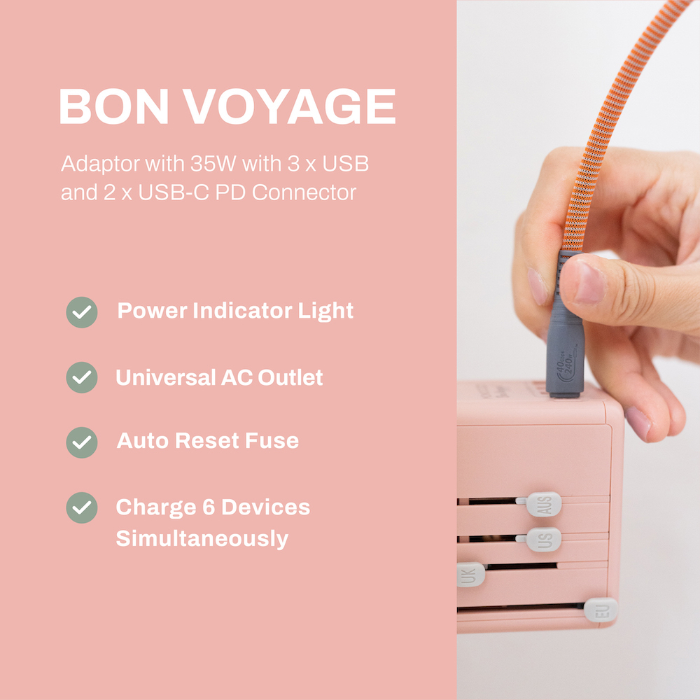 Bon Voyage 旅行適配器是您完美的旅行夥伴,因為它與 150 多個國家/地區兼容,在您過境時只需按下並滑動即可更換插頭! 它還具有三個 USB ,一個 USB-C和一個 USB-C PD 端口,輸出高達 35W,讓您可以隨時隨地為您的手機及配件充電。 這款裝有雙保險絲的旅行插座適用於電壓高達 7A/250V 的小型電器。