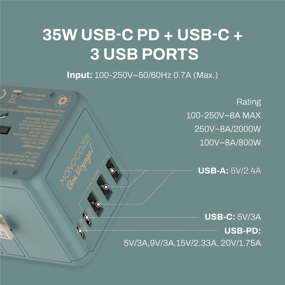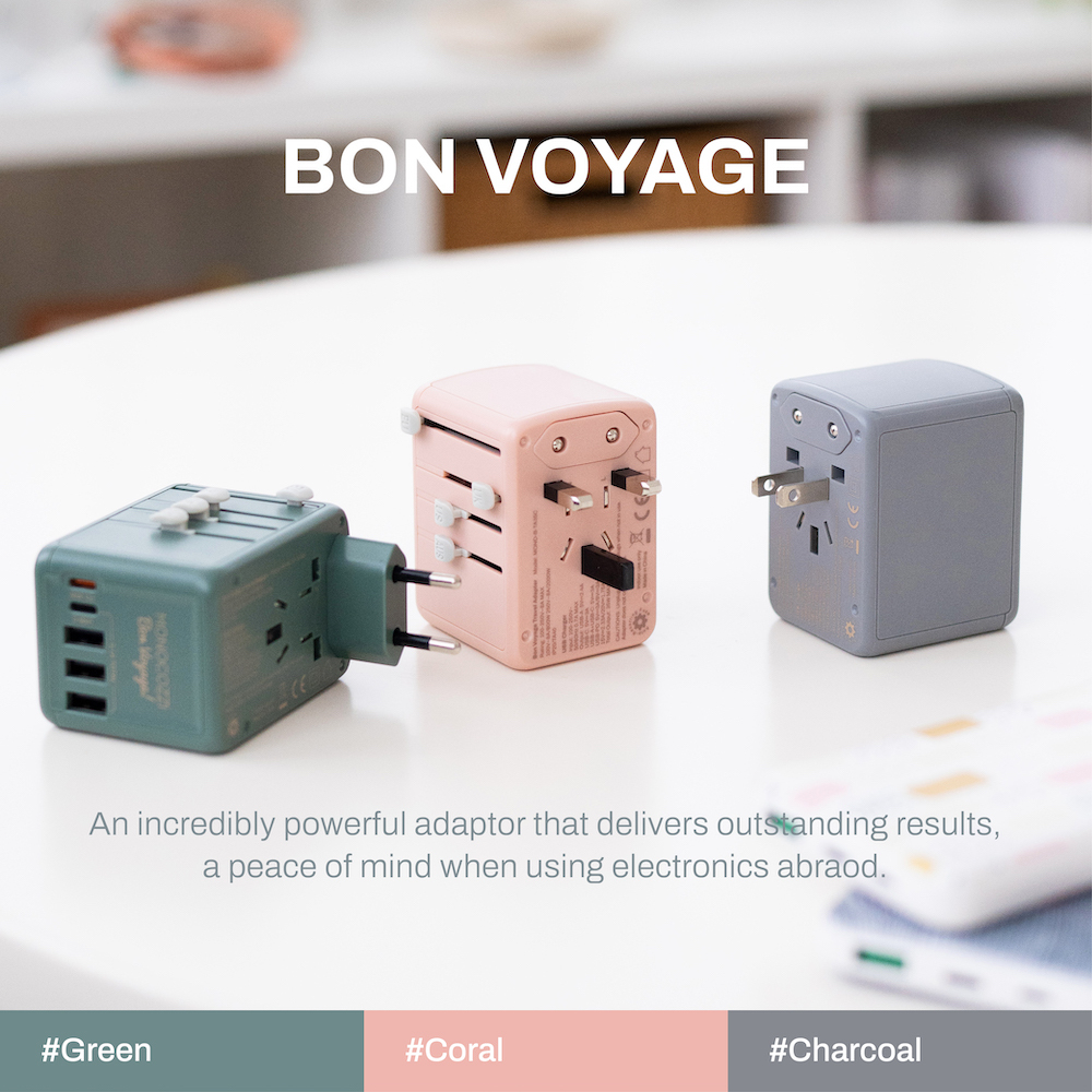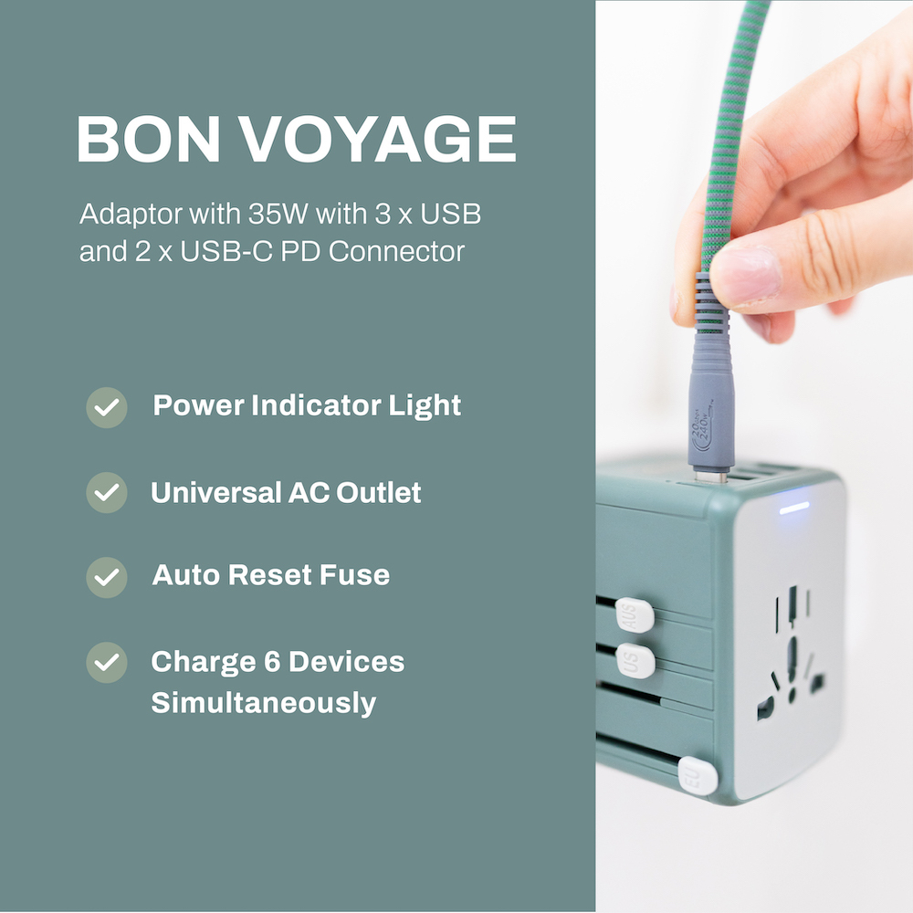 Bon Voyage 旅行適配器是您完美的旅行夥伴,因為它與 150 多個國家/地區兼容,在您過境時只需按下並滑動即可更換插頭! 它還具有三個 USB ,一個 USB-C和一個 USB-C PD 端口,輸出高達 35W,讓您可以隨時隨地為您的手機及配件充電。 這款裝有雙保險絲的旅行插座適用於電壓高達 7A/250V 的小型電器。