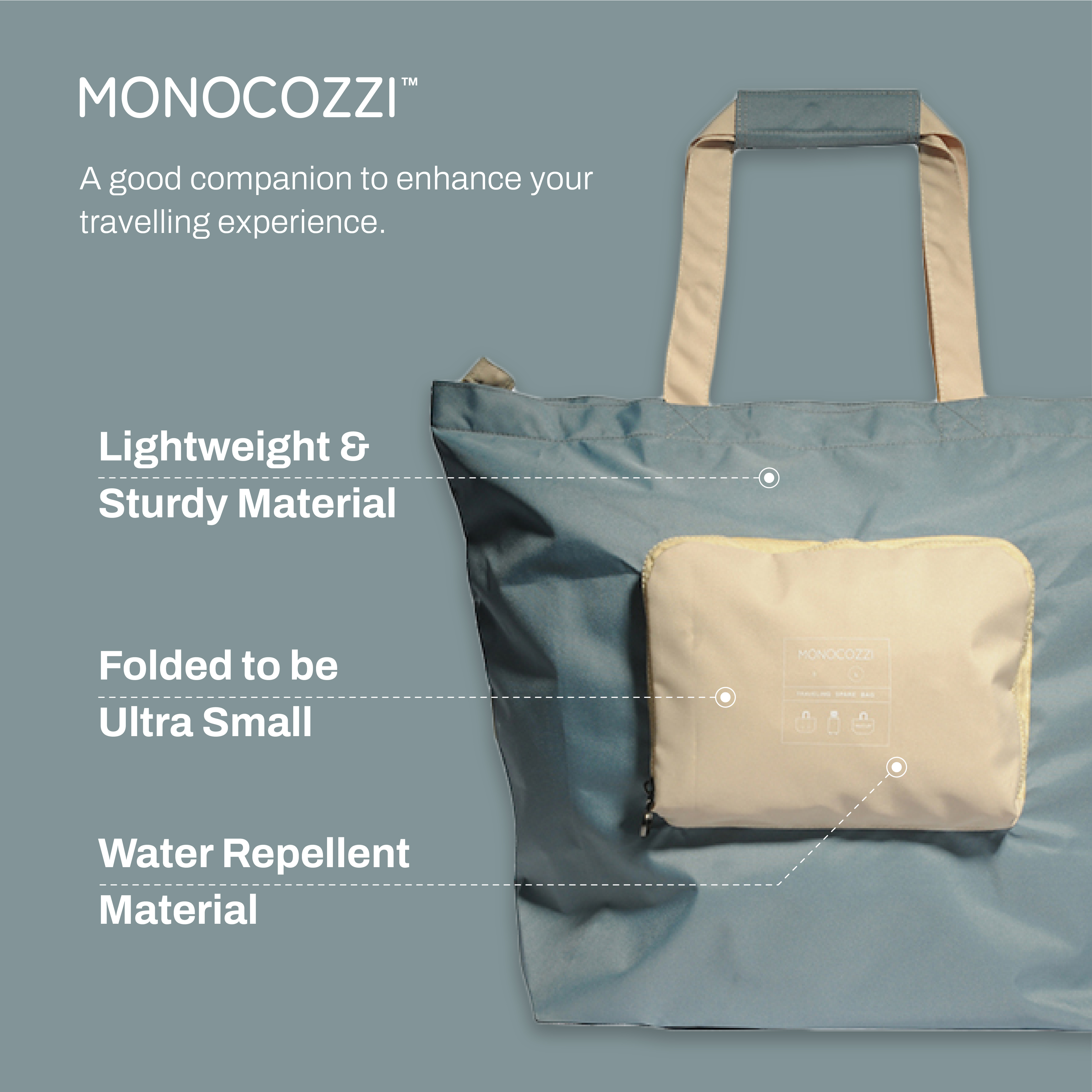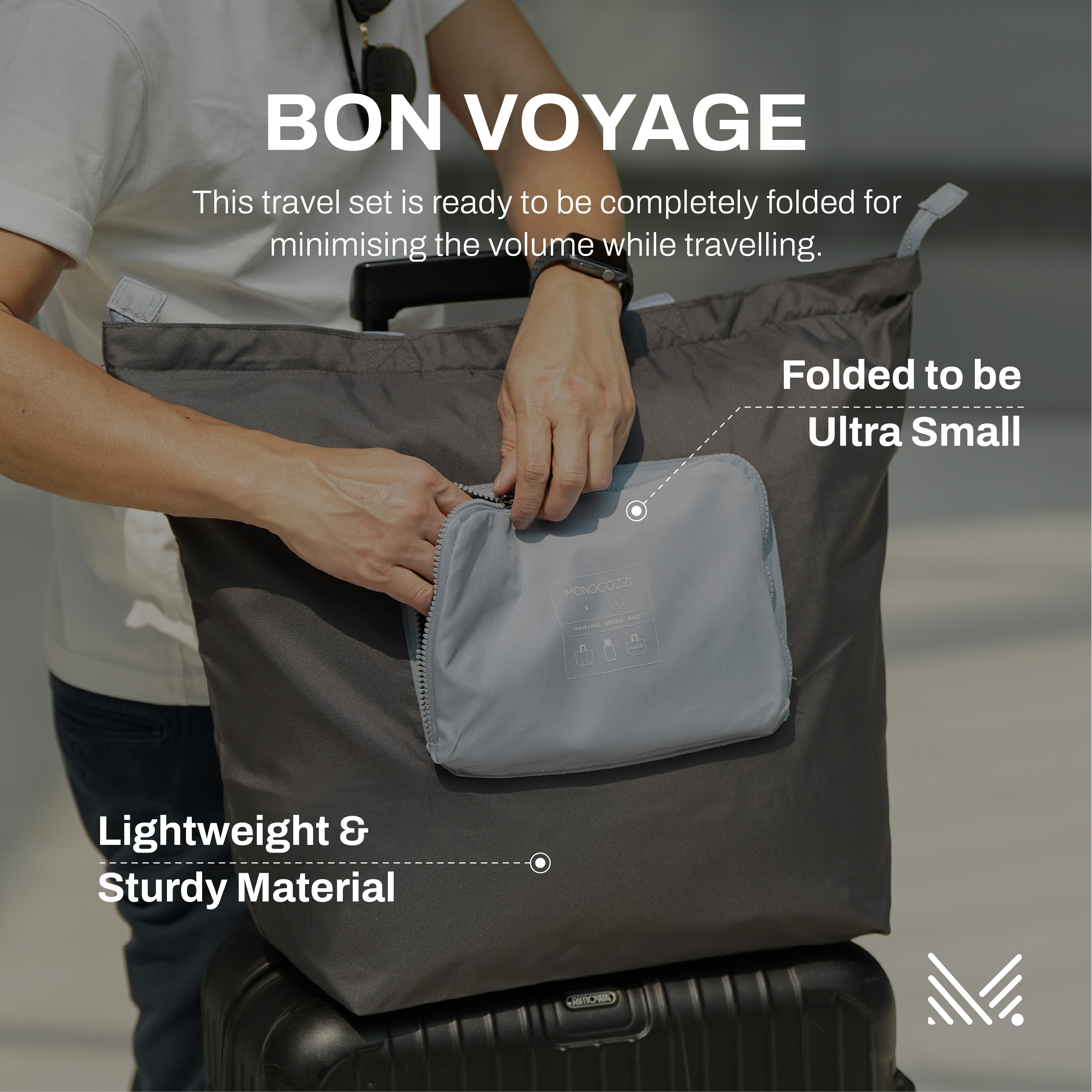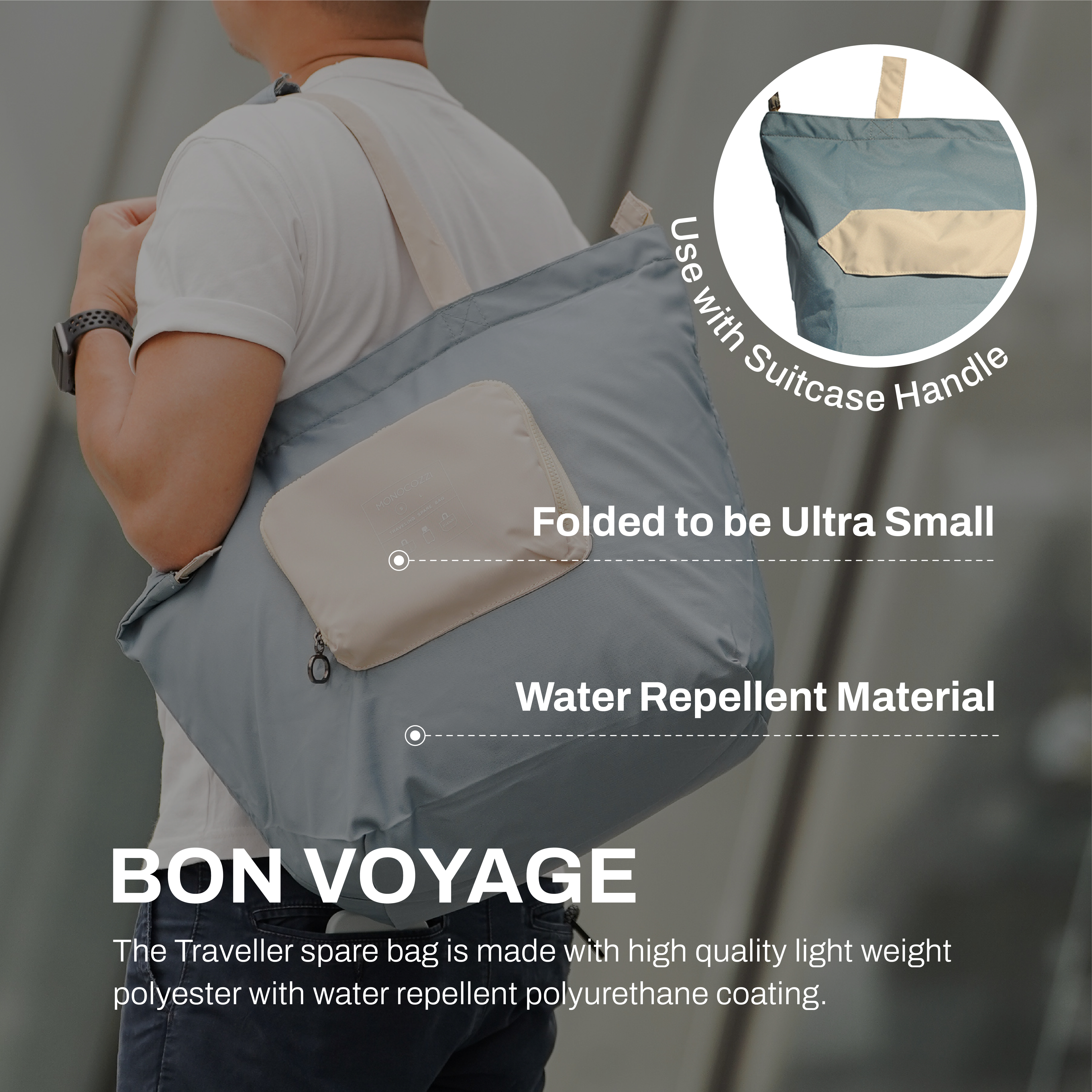 當每次旅行時想到因為行李箱沒有位子而不敢盡情購物實在是一件非常掃興的事。Monocozzi 的摺疊輕便後備旅行包以高質量環保輕巧抗水物料製造而成。雙拉牌設計令你可以把行李鎖起然後寄艙。背後的手提行李拉桿帶可以令你輕易將手提行李的拉桿插入然後穩穩的放在手提行李上而輕易的四摺便可以令他好好摺合收藏。