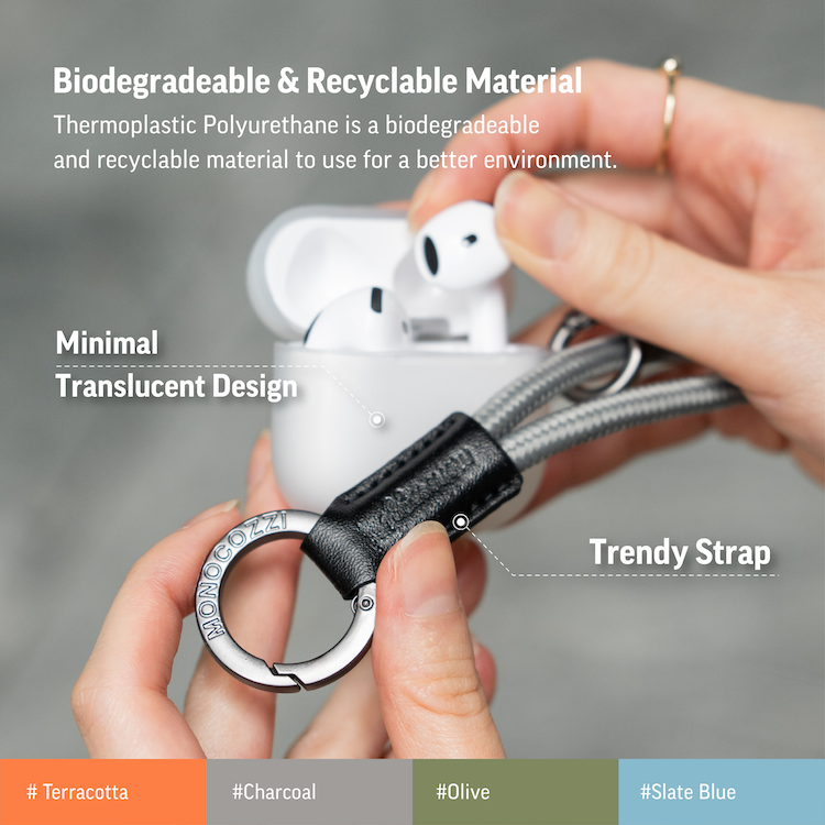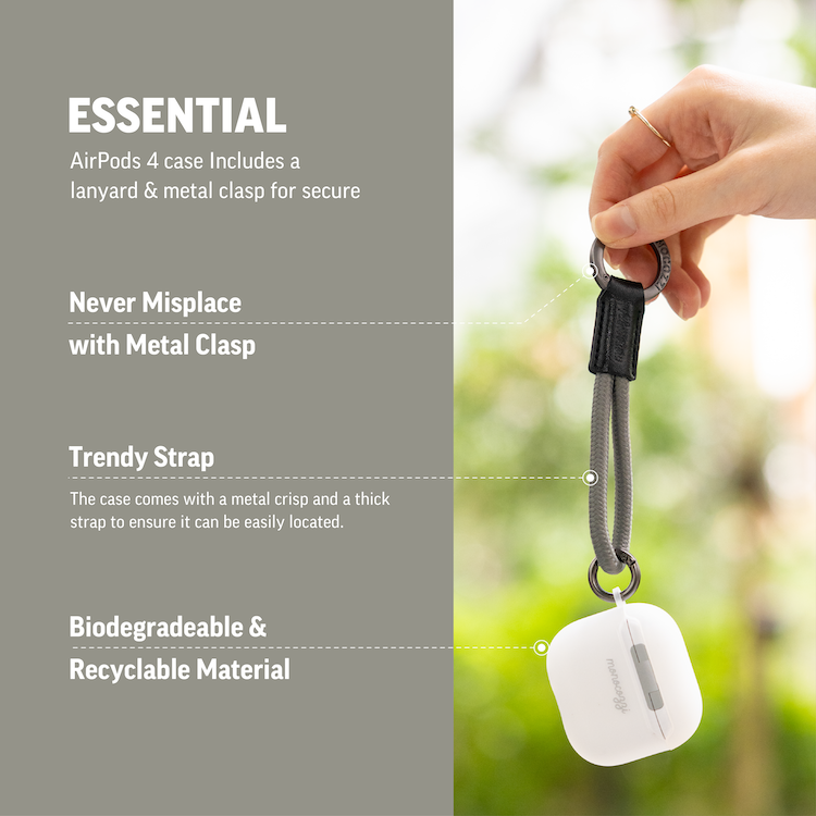 這款適用於 AIrPods 4  ESSENTIALS 半透明外殼採用優質熱塑性聚氨酯精確製成,這是一種高度保護的 100% 可生物降解和可回收的材料。 金屬搭扣還可以讓您將 AirPods 夾在牛仔褲或手提包上,這樣可以保證您不會放錯位置並永遠消失。