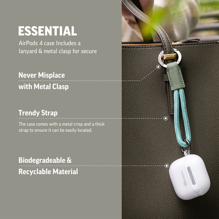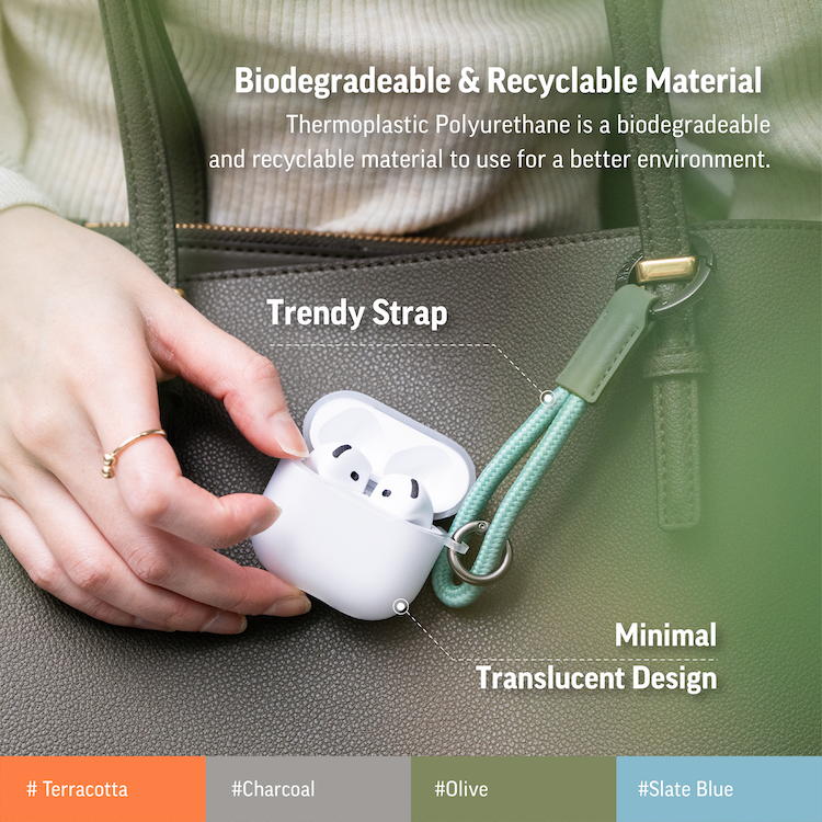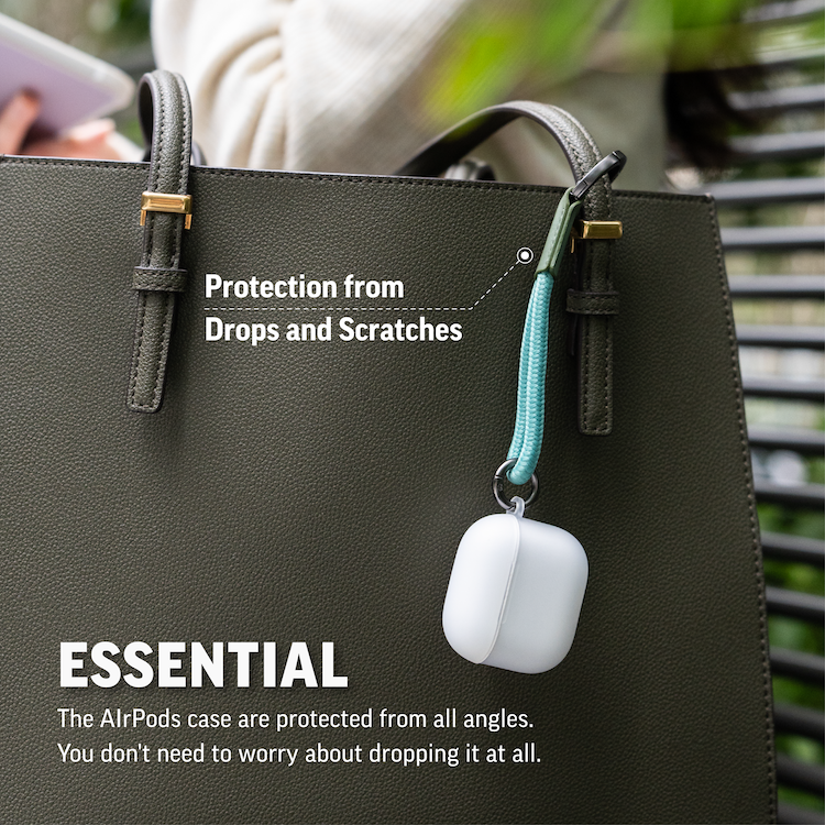 這款適用於 AIrPods 4  ESSENTIALS 半透明外殼採用優質熱塑性聚氨酯精確製成,這是一種高度保護的 100% 可生物降解和可回收的材料。 金屬搭扣還可以讓您將 AirPods 夾在牛仔褲或手提包上,這樣可以保證您不會放錯位置並永遠消失。