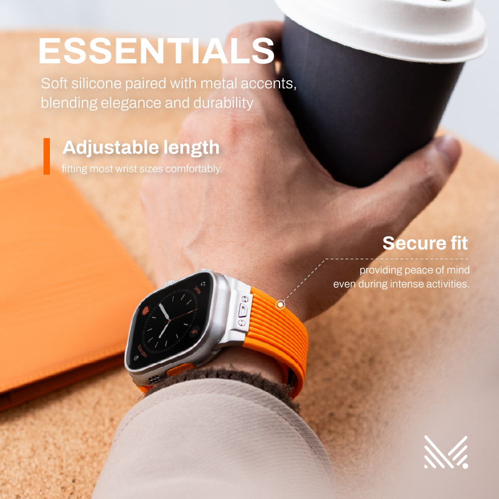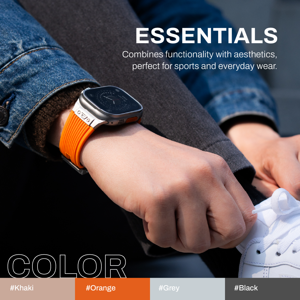 ESSENTIALS 尚品液態矽膠錶帶將功能性與時尚現代的美學相結合,適合運動及日常佩戴。