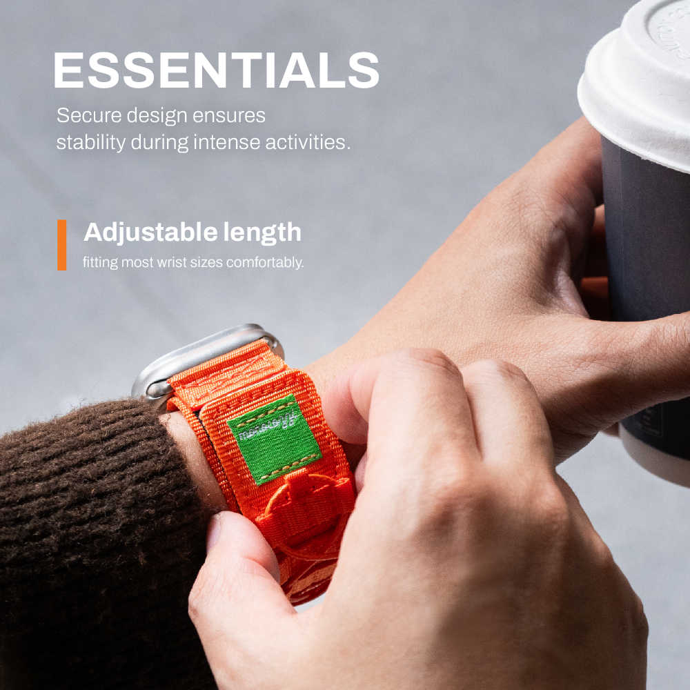 來介紹我們的 ESSENTIALS 耐用尼龍表帶,它專為 Apple Watch 設計。這款錶帶採用優質材料製成,確保您可以自信地將 Apple Watch 帶入最具挑戰性的戶外活動中,並且同時保持風格。這款表帶採用高品質尼龍,非常適合水上運動,並能快速排汗。可靠的高品質魔術貼與扣件系統確保您的 Apple Watch 在任何情況下都能穩固地佩戴在手腕上,讓您在冒險中安心無憂。