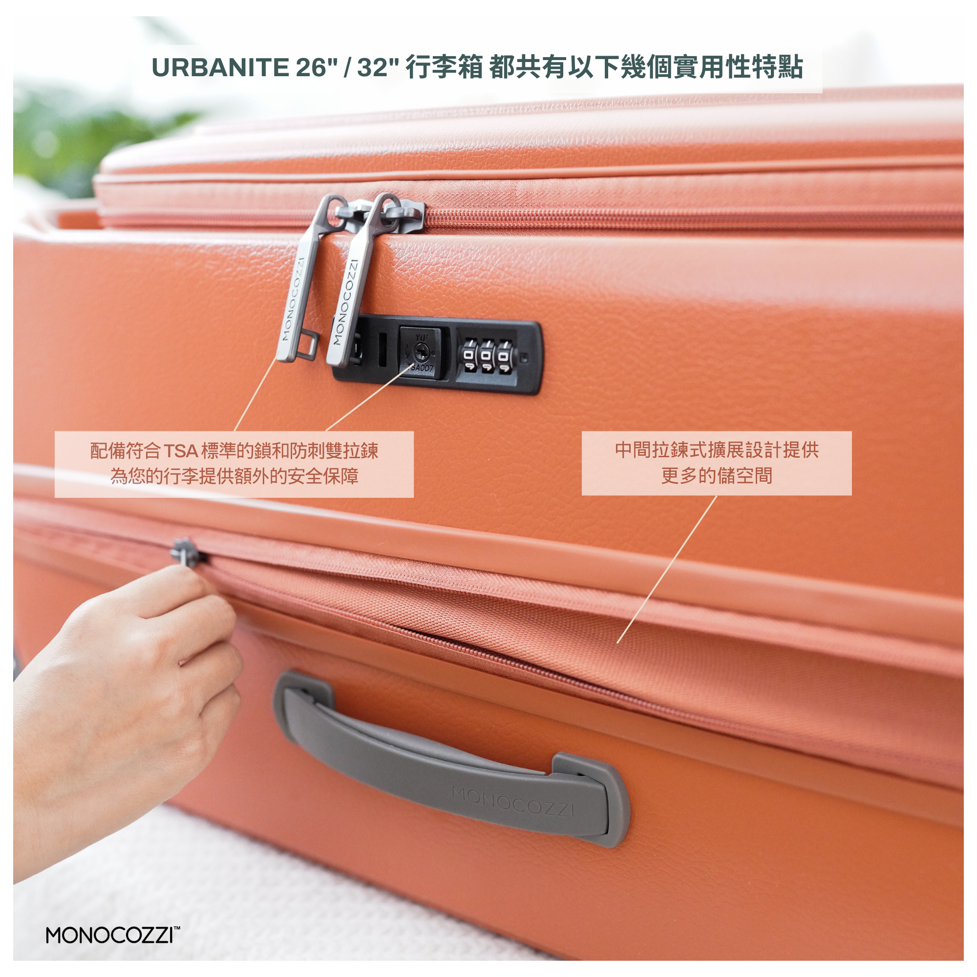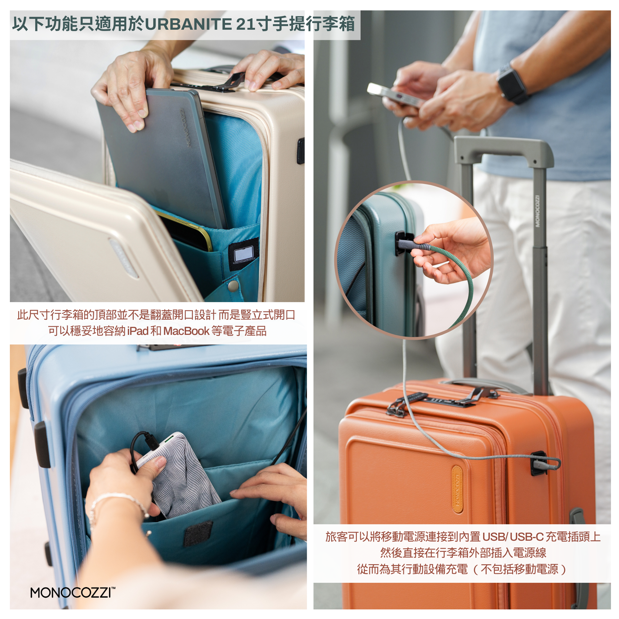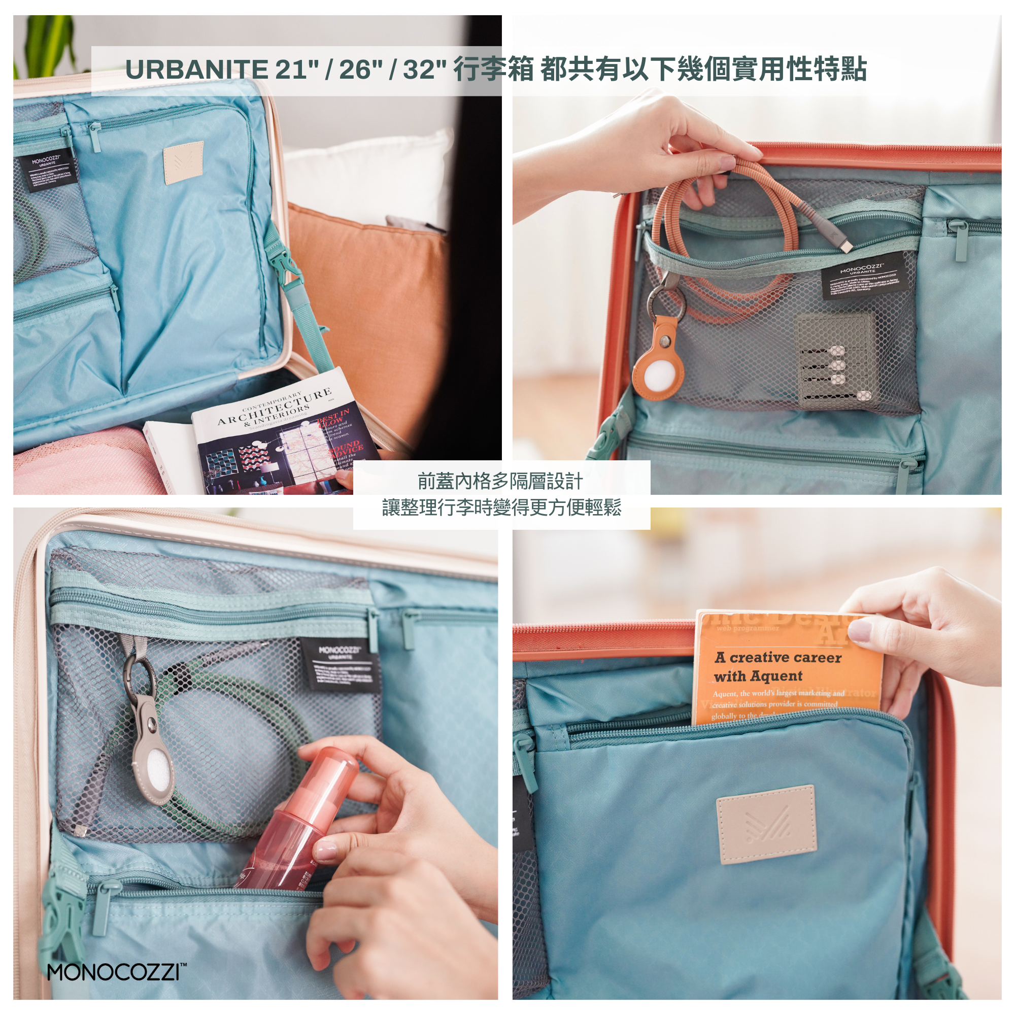 MONOCOZZI 的 URBANITE 三合一套裝是一組時尚、實用且多功能的旅行箱組合。26" 和 32" 是前開式旅行箱,它們比相同尺寸的行李箱具有更大的容量,其前蓋內格多隔層設計,讓整理行李時變得更方便輕鬆。為了提供充足的存放空間,行李箱中央設有一條拉鍊,可以通過拉開拉鍊來擴大行李箱的容量。此系列採用耐用的聚碳酸酯外殼製成,配備符合 TSA 標準的鎖和防刺雙拉鍊,為您的行李提供額外的安全保障。21" 手提行李箱版本還配備了內置的 USB/USB-C 充電口和豎向開口,方便攜帶電子設備。此尺寸行李箱的頂部並不是翻蓋開口設計,而是豎立式開口,可以穩妥地容納 iPad 和 MacBook 等電子產品。